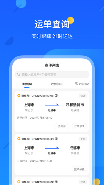 德邦快递app官方版是一款专注于物流快递配送的手机应用软件。用户登录这款软件可以很方便地办理有关德邦快递的各类事务,例如预约寄件、物流查询、管理地址等,让寄件更加轻松快捷。用户如需寄件可以通过软件在线预约寄件的功能来预约取件时间、地点,这样附近网点的快递员就会按照预定时间上门来取件了,并且用户还需要根据快递的重量缴纳相应的运费,这样寄件的流程才算完成。当快递在运输派送的途中时用户可以通过物流查询功能随时查看快递的实时位置,可以通过这些信息判断大致的送达时间,无论是收件人还是寄件人只要有快递单号就能够查询物流。此外,如果用户的快递在配送途中出现受损的状况还可通过平台的理赔功能与客服沟通赔偿事宜,依照相关规定与双方的协商来决定最终的处理方法。如果用户货物因异常情况被送回时平台会及时通知用户处理问题。