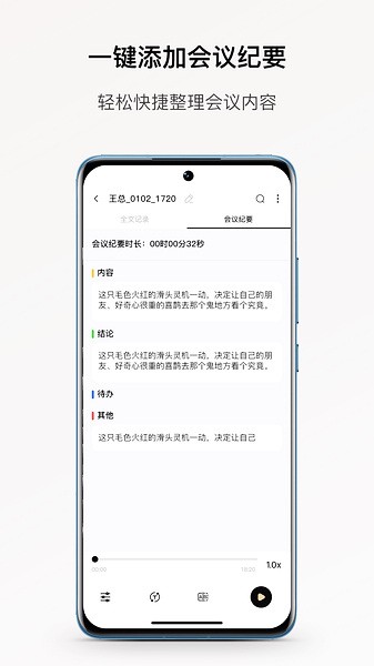 ①会议内容实时转写,1小时音频5分钟快速出稿,中文识别准确率高达98%