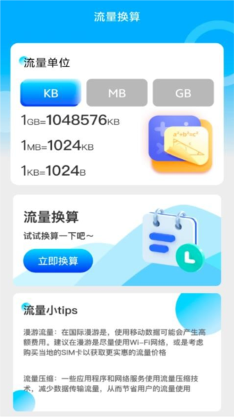 流量换算: 强大的流量单位转换器,支持多种常见单位之间的快速换算,便于理解不同套餐的使用情况。