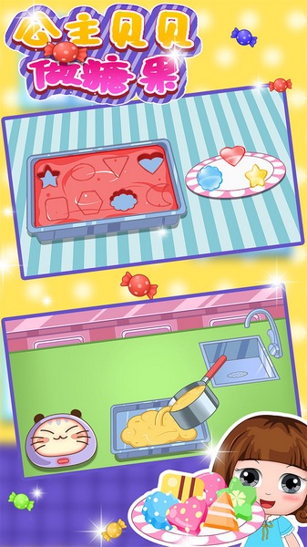 2、自由创意工坊:提供超20种免费食材和30+可爱模具,支持混合不同颜色糖浆制作渐变糖果,充分释放孩子的想象力。