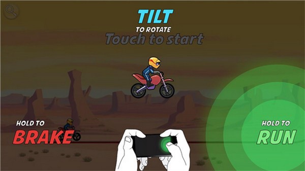游戏的控制方法非常简单,右手按住屏幕启动加速,左手急刹(没有倒退),此外,还需通过设备的重力感应来调整摩托车的平衡,它可以前倾或者后仰,这取决于你脚下的路。