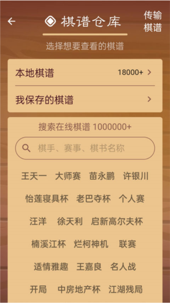 该模式中我们可以查看选择不同的棋谱,同时也支持本地导入棋谱,当然你也可以在线搜索棋手、赛事、棋读;