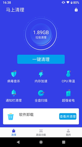 马上清理APP是一款清理手机垃圾的安卓软件。你是否时常感到手机内存不够用,或者是卡顿以及遇到带有病毒的捆绑软件?这款软件可以很好的帮你解决这些问题,它除了可以清理垃圾之外,还可以对手机进行加速、查杀病毒,还有极其便捷的应用管理功能。用了这款软件之后,可以很好的解决手机内存不够和卡顿之类的问题。此外软件使用起来也是非常简单的,很好的满足了每一位用户清理手机内存的需求。如果你的手机也出现了诸多类似的问题,那就赶快下载这款软件吧,马上清理让你一键释放内存。