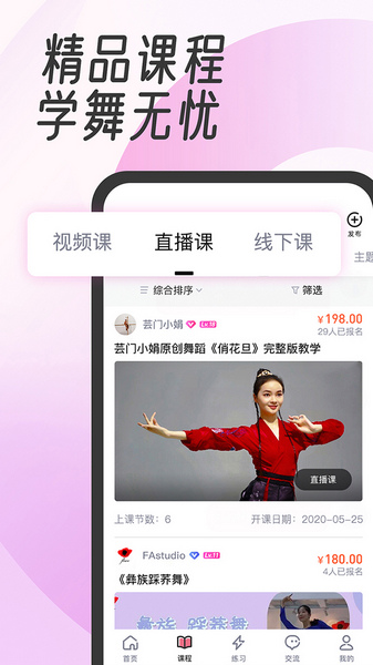 5、海量免费舞蹈教学视频、原创作品任你学、反复练。舞蹈明星名师精品付费舞蹈课程有评价、有保障、放心购。