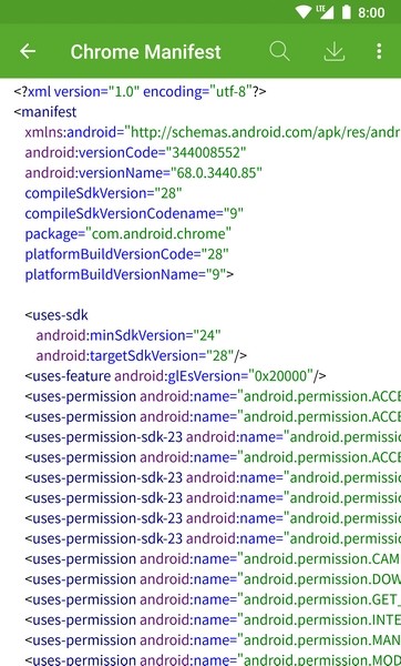 支持查看任意 App Manifest 信息,支持查找,支持以 TXT 或者 HTML 格式保存到 SD 卡。