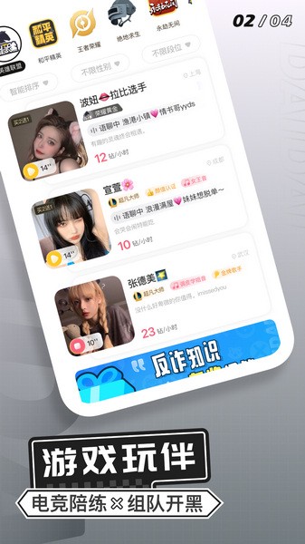 覆盖众多热门游戏,各类高颜值大神,全程连麦陪练游戏,游戏陪玩、游戏陪练、代练、电竞高手,应有尽有,满足你的开黑上分高需求!在贴心陪玩中享受游戏的乐趣! 更有狼人杀、谁是卧底、你画我猜等互动小游戏,迅速破冰,找到属于你的甜蜜!