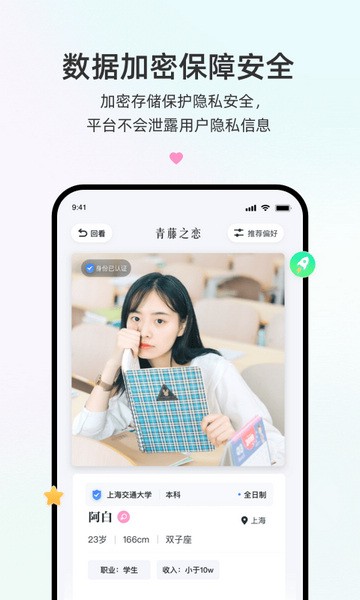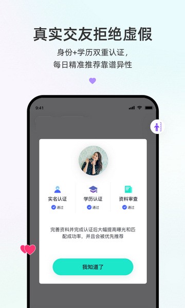 每个人都要经过人工资料审核+实名学历双重认证才能交友