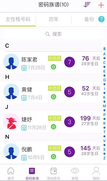 2、密码族谱中划分了不同的信息栏,有主性格号码、流年信息以及备份的数据;