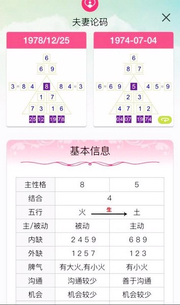 5、在夫妻论码页面中展示丰富的内容数据,看得到双方的不同以及两者的性格偏向等;