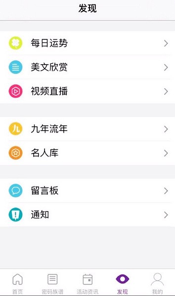 6、密码酷发现中心为用户提供了更多资源,汇集了众多名人资源,有九年流年、视频直播以及美文欣赏等服务栏;