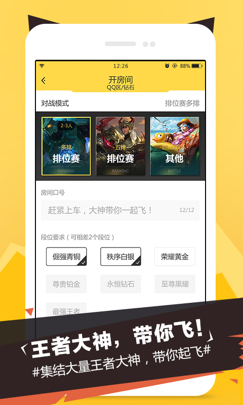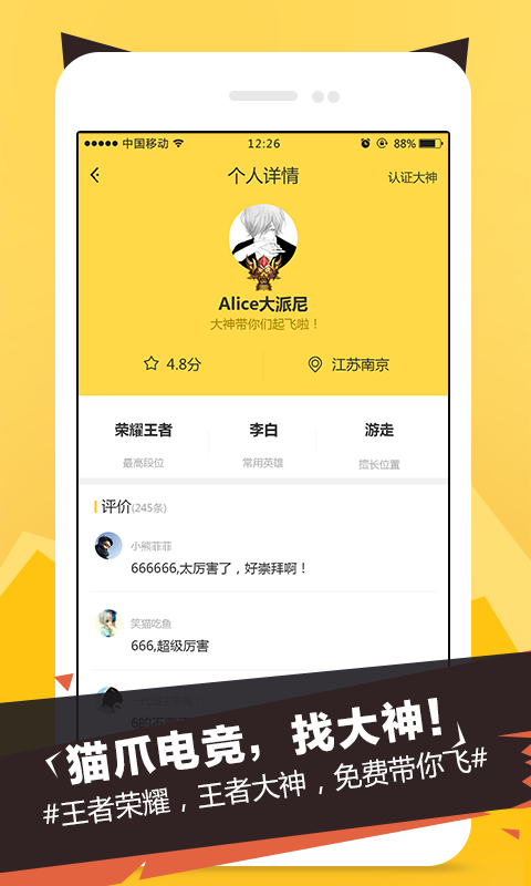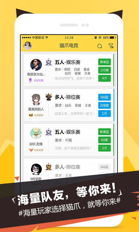 猫爪电竞是国内首创专业的电竞服务平台,以房间的组队形式,