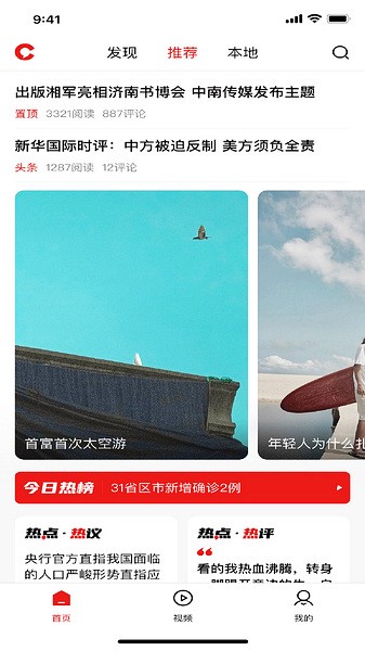 1、打开晨视频app,进入首页,首页有发现和推荐栏目,用户可观看近期新闻热点及视频,点击我的;