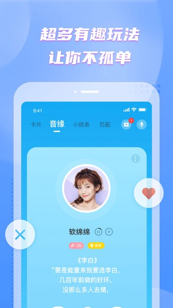 软件亮点包括线上相亲、专业红娘调节气氛、同城小伙伴定位等功能。特色是年轻人专属的交友社区,实名制认证严格审核,保障交友环境真实安全。此外还有生活圈动态分享、趣味话题互动等丰富功能,让用户在忙碌生活中找到心灵栖息地,遇见属于自己的缘分。