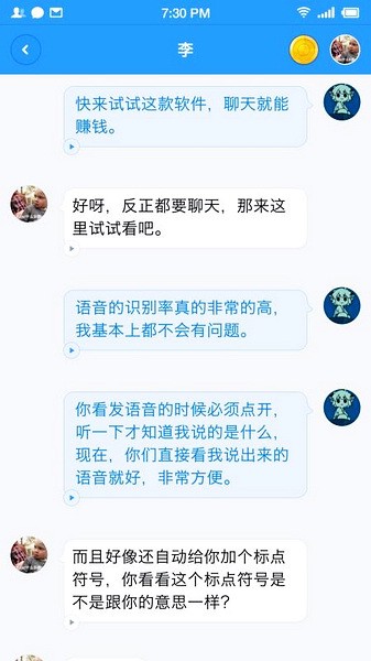 最近我发现了一款挺有意思的社交软件叫聊天宝,这是由罗永浩团队开发的,前身是子弹短信。它的最大特点就是可以通过各种操作轻松赚钱,比如加好友、阅读文章甚至与人聊天都能得到金币奖励,界面也很简洁清爽,没有烦人的广告。