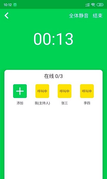 5、在线通话时,可以选择全体静音模式,直接的添加通话人员至通话的界面;