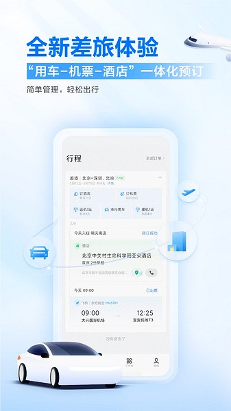 -酒店:覆盖50万+优质酒店终端;将网约车与商旅场景深度融合,综合计算时间成本与行程费用估算,规划更优出行方案;超标部分可由个人垫付,满足差旅人士个性化需求;