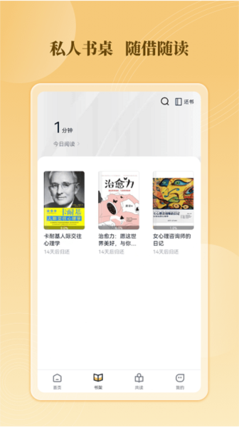 3、自动归还图书的功能不再有线下图书归还的烦恼,系统会自动按借阅期归还图书,省去了许多繁琐的步骤。