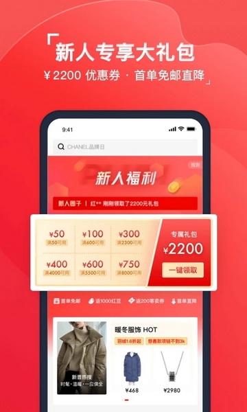 新人注册就送2000元新人购物礼券,享受首单免邮 ,红豆抵现