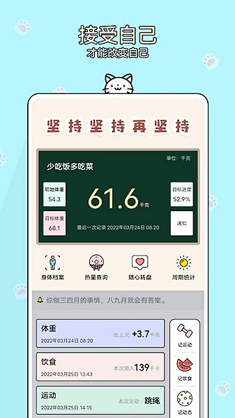 总的来说,体重记app是一个很不错的健康管理工具,适合那些想要科学减肥、健身的朋友。它不仅记录数据,还能通过多维度分析帮助用户更好地了解自己的身体状况。如果你也在为健康问题烦恼,这个app绝对值得一试!