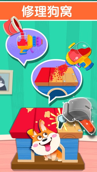 小狗的房子坏了,快帮他修好房顶,再刷上漂亮的油漆,小狗看见好开心;清理破掉的墙纸,挑一张粉红墙纸贴上,家里变得好温馨!(激发宝宝创造力。)