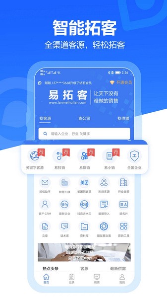 专注于提供全国各行业的客源信息挖掘,已经成为全国各行业业务员和老板们的找客户拓客神器,为各行业的老板、批发商、经销商、渠道商、销售人员提供精准客源服务。app 拥有关键字企业查询,全行业企业查询,附近客源查询,供需求查询等多项功能,可以帮助您快速完成您的每一个需求,让您让有效的找到精准客户,拓客能力提升。