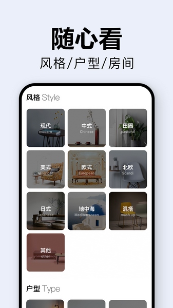 - 多样风格,包含简约、现代、中式、欧式、美式、田园、地中海、日式、东南亚、混搭、新古典等14种风格;