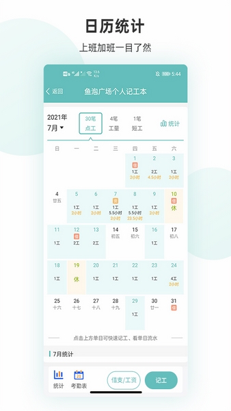 工地记工是一款专为工地打造的管理软件,其可以帮助广大工友、班组长进行记录工天、工时等事项,且操作简单便捷,并以日历形式实时显示上班、加班天数,一目了然!且用户还能通过软件进行记账,每月收支清晰记录,更能查看全年收支情况,同时软件还搭配了水印相机,帮助用户实时拍照记录施工现场,让信息更真实!软件使用起来也是非常便捷的,很好的满足了用户记工的需求。