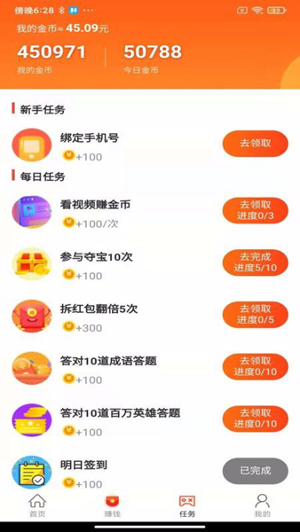 2.丰富的趣味任务 用户通过完成各种各样的任务来赚钱金币、红包。