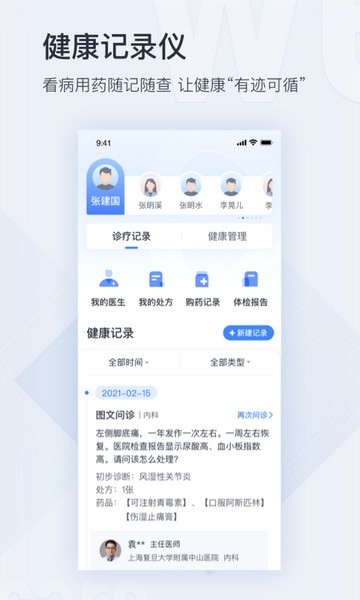 记录仪:不会丢的家庭病历本!线上挂号问诊开药,随时随地查找。病历本、体检报告、健康信息,您关心的都能记录。每一次记录,都在更好地管理您和家人的健康。