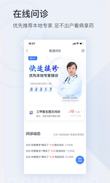 极速问诊:3分钟找到三甲专。2000+三甲医生在线接诊提供7*24小时服务;深度交流不限次数,好评率高达99%
