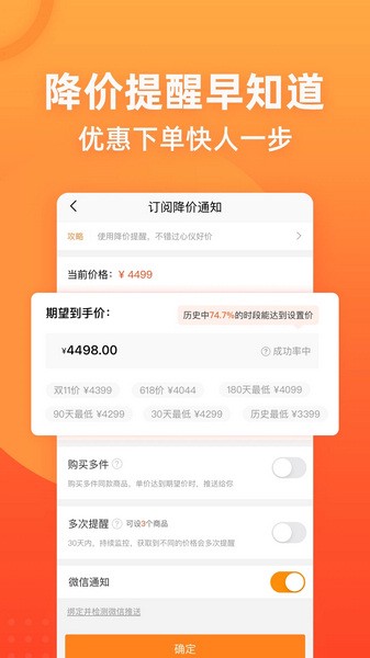 个性好价订阅,智能订阅关键词推送,从上千条折扣中筛选并推送你关注的优惠商品,轻松实现特价特卖监控,让你不再错过商品打折信息;