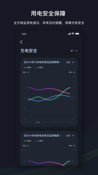 安全充电,除了充电控制,挚达APP还可监测并分析用电环境安全情况,及时告警各类异常情况,让用户体验数据可视化下的安全充电。