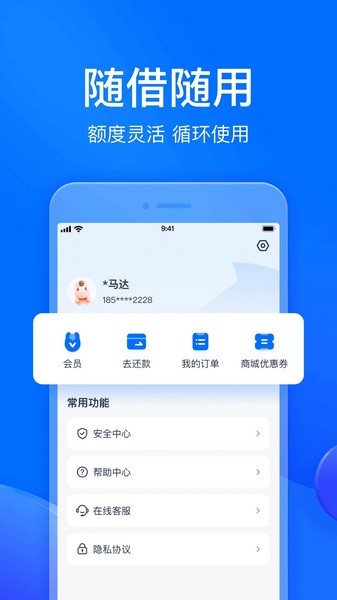 4、操作体验好:支持线上贷款申请,方便快捷,借钱期限灵活,年化利率(单利)7.2%-24%。