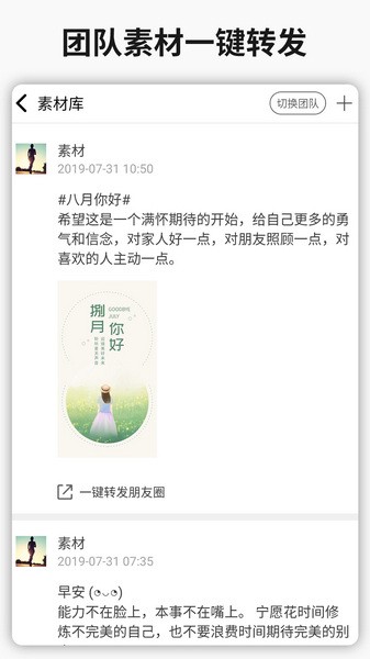 2.素材库:我们准备了一些微商常用的图片,比如聊天背景图,而且用户可以上传自己的照片到素材库,方便使用。