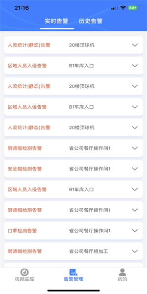 【告警管理】查看全部摄像头下的实时告警及历史告警消息。