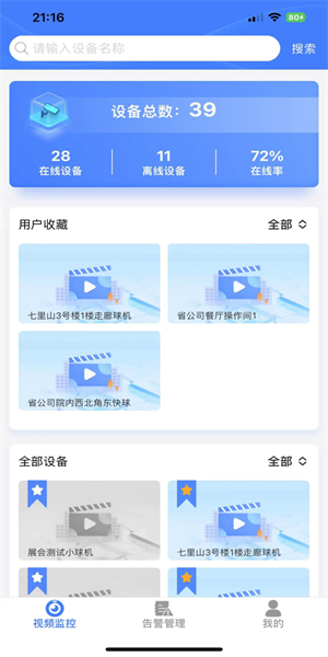 【首页】根据设备名称模糊查询、置顶按钮、设备在线、离线及在线率数据统计、设备通道信息编辑、设备分组及分组下的监控信息展示。