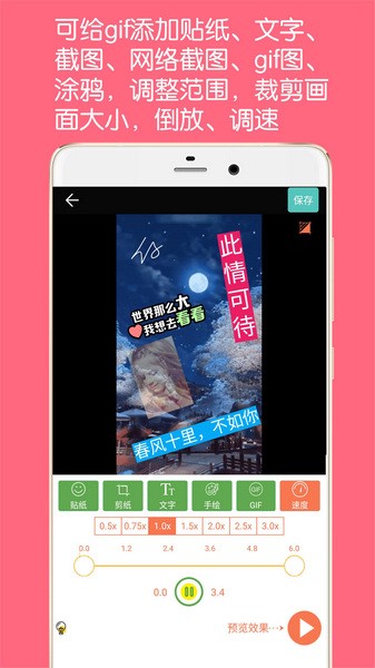 GIF动图制作APP由吉安市吉州区云横网络科技有限公司推出,能帮助用户在手机端快速便捷的制作各种GIF动图,界面简洁清爽,功能强大丰富,操作简单便捷,用户可以随心裁剪视频内容、编辑截图、进行片段拼接等操作,还能添加各种贴图、水印、文字等内容,让你的GIF图效果更精彩!在制作完毕后还能一键分享到朋友圈,让好友与你一同分享欢乐!