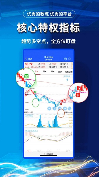 3、趋势买卖点:实时运用“多”、”空“提醒趋势变换,直观提示买卖点建议,让炒股变得简单!