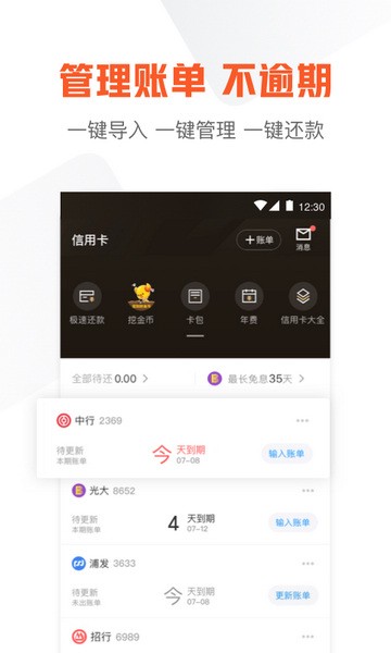 贴心:及时提醒还款,账单永不逾期。功能齐全,一网打尽所有信用卡周边服务。