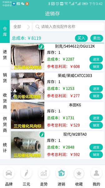 4、在进销页面里,自行筛选查找各三元催化器的成本价、进货价、利润等