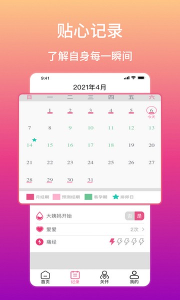 完整记录:满足您日常记录经期、流量、症状、爱爱、心情、排卵测试的需求