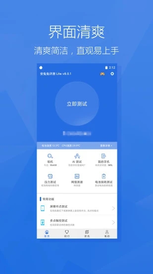 集硬件性能评测、HTML5测试、电池测试、视频测试、稳定性测试等五个测试项于一体全面测试设备的硬件、系统及电池等各项性能。