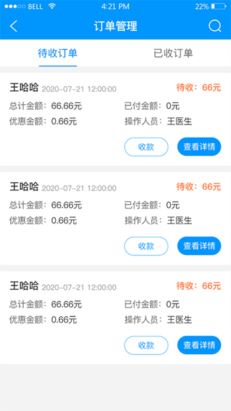 提供了订单管理的功能,对诊所的待收订单可以实时的管理。