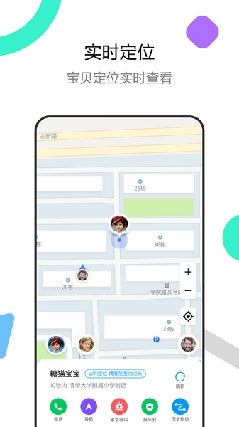 精准定位,实时追踪:自主研发混合定位技术,精准度业内第一,宝贝位置实时掌握。