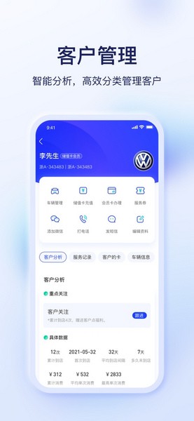 4、进入客户版块,查看自己店铺的客户数量和储值卡总金额信息,了解各客户车辆详情