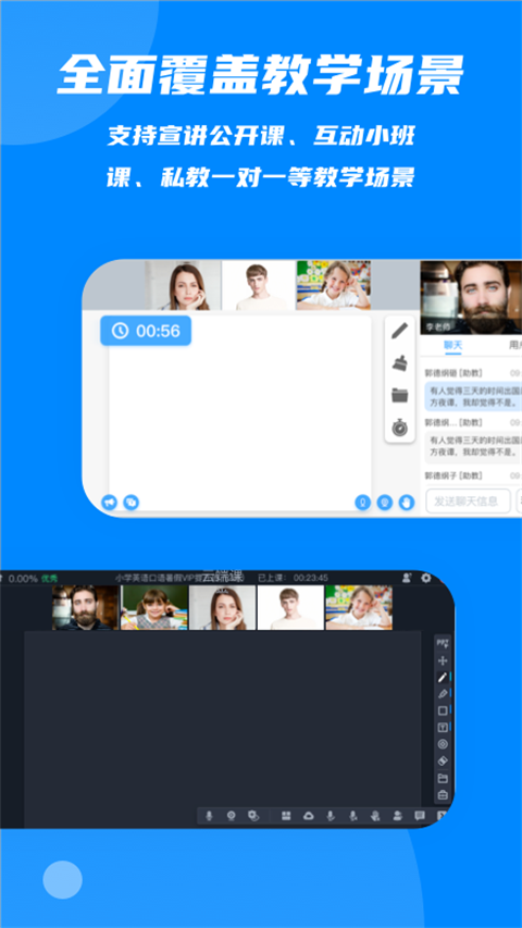 云端课堂APP是一款主打线上教学的软件,界面简洁清爽,功能丰富操作便捷,通过前沿网络科技,打造画面高清低延迟的互动直播教学平台,适用于大班课、小班课、一对一、企业培训等场景,支持多端观看,无论是手机、电脑、平板都能进入直播间,同时可以进行本地和云端录制,轻松生成视视频,帮助学员重温课程,掌握巩固知识点,并为企业、教育机构等领域,提供多种直播授课的解决方案,让线上授课更加轻松。