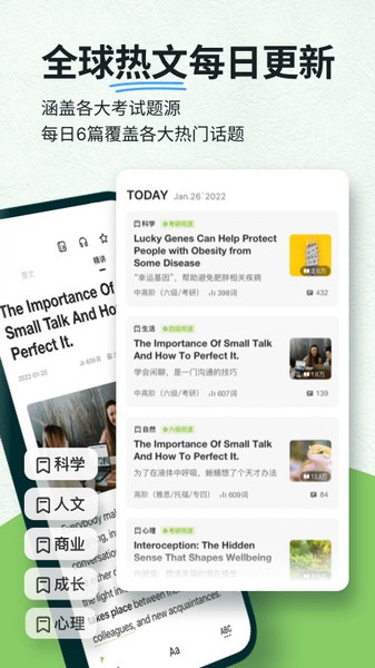 这个App的理念是“用英语学”,通过阅读来提升语言能力,而不是单纯的背诵。确实,我发现每天坚持读英文文章后,词汇量和语感都有明显提高,感觉学英语变得更高效了!