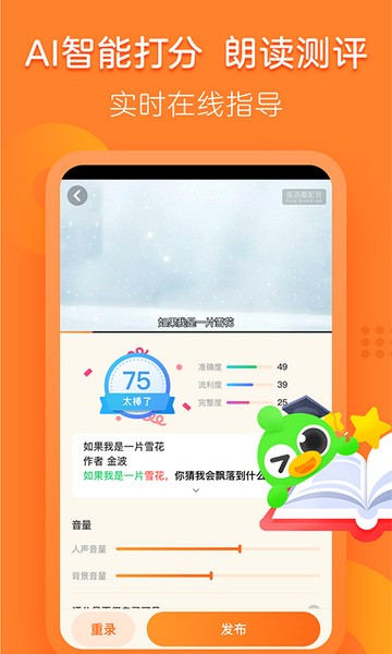语文趣配音app是一款专为中小学生们打造的语文学习和配音软件,各种教材同步课程和精选美文可以让大家自由学习和朗读。此外,软件还为大家提供了超多精品作文素材,不仅能够为同学们的写作带来更多的灵感,也能够丰富大家的素材库,写作文也能够信手拈来。软件独特的AI智能打分功能和朗读测评内容则可以让大家更快提高自己的朗读水平。