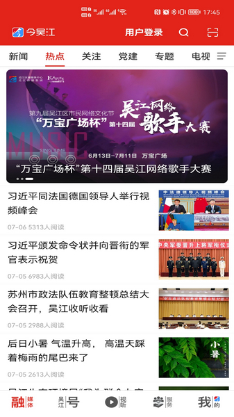 今吴江APP是一款专门为苏州市吴江区居民所开发的应用。该应用致力打造及新闻媒体,自媒体视频以及城市生活服务的一站式平台。在今吴江内,用户可以查看国内,苏州市乃至吴江区的大小热点新闻,让用户紧跟时事,还会为用户推送许多有趣的文章,以供用户消遣。今吴江与政府齐心协力,共同为吴江民生努力,多个吴江政府部门入驻应用,让用户可以在线上就能办理政务,与政府的关系变得更加亲切紧密。在应用的视听界面,包含微视,直播,影视三大板块,用户可以观看视频来查看吴江周边的大小事。应用内还有许多便民服务,让用户在线上足不出户就能享受到更快捷便利的服务。不管你是土生土长的吴江人,还是来到吴江生活居住的新吴江人,今吴江都是你们不能错过的应用。