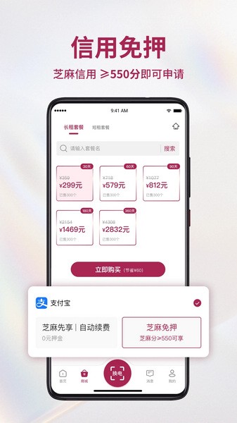 4、在套餐选择页面,即可获取支付宝支付信用分免押租电池